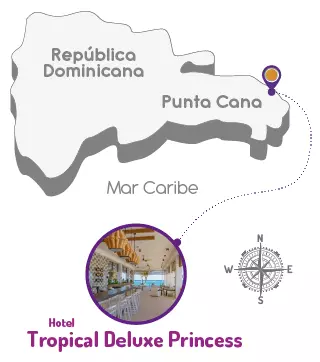 El Hotel Tropical Deluxe Princess se integra perfectamente con la extraordinaria belleza de las playas de Bávaro, que se encuentran en la provincia de Altagracia, República Dominicana. A tan solo 25 kilómetros del Aeropuerto de Punta Cana, este resort se encuentra rodeado de un hermoso palmeral y está ubicado directamente en la playa, lo que lo convierte en el destino ideal para disfrutar de unas vacaciones en familia felices en uno de los mejores hoteles de vacaciones en Punta Cana.